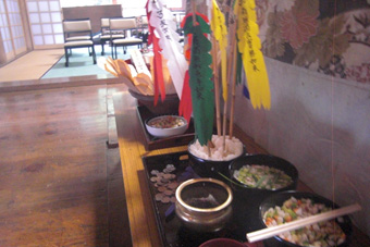 「お施餓鬼」はお腹をすかせてのどの渇いた餓鬼に施す法会です。『餓鬼草紙』などには、ガリガリにやせて、お腹ばかり膨れ、口から炎を吐いて醜く、恐ろしい姿が描かれています。地獄道や餓鬼道に落ちた人を救うために、寺院では施餓鬼棚を設けます。また一般の家庭では、お盆には床間に精霊(しょうらい)様としてご先祖をお祀りし、ナスやキュウリなどを供え、先祖様をお迎えすると同時に、無縁仏や餓鬼にも供養します。